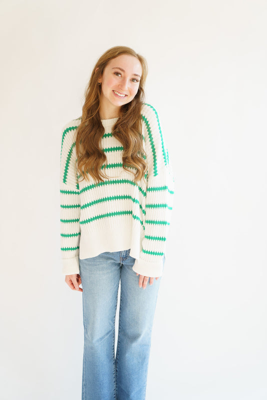 Boat Neck Striped Knit Sweater- Green