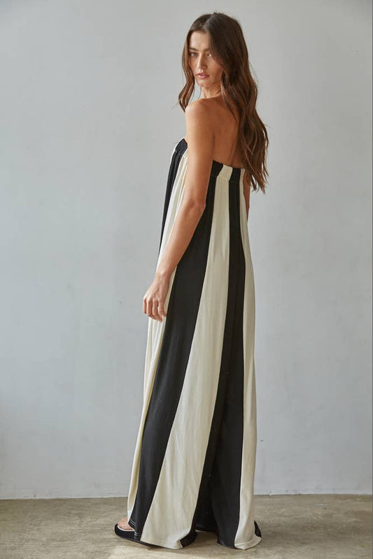 Striped Tube Wide Leg Jumpsuit- Black