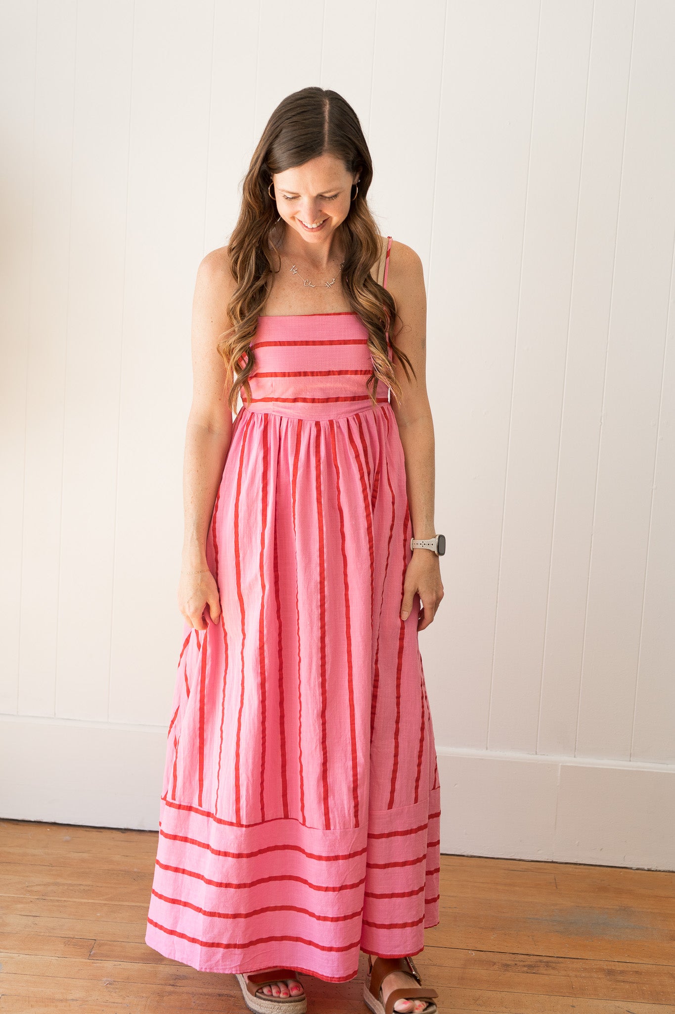 Woven Cotton Striped Square Neck Spaghetti Strap Flare Midi Dress With Open Back Detail And Back Smocking, Side Zipper With Lining